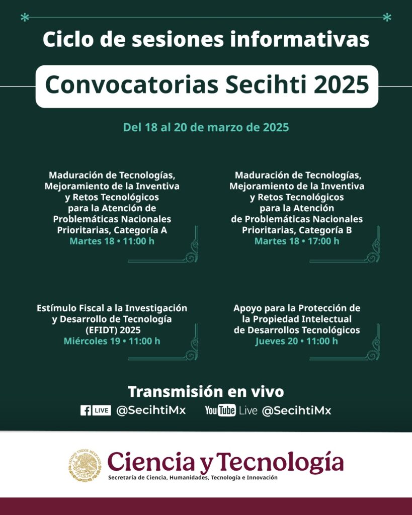 La Secretaría de Ciencia, Humanidades, Tecnología e Innovación, a través de la Subsecretaría de Desarrollo Tecnológico, Vinculación e Innovación (SDTVI), organiza el ciclo de cuatro sesiones informativas para dar a conocer las convocatorias publicadas, con las cuales se busca implementar acciones para impulsar y fortalecer el desarrollo tecnológico y la innovación; mismos que permitirán la vinculación de los sectores público, social y privado, a fin de promover la generación de soluciones.