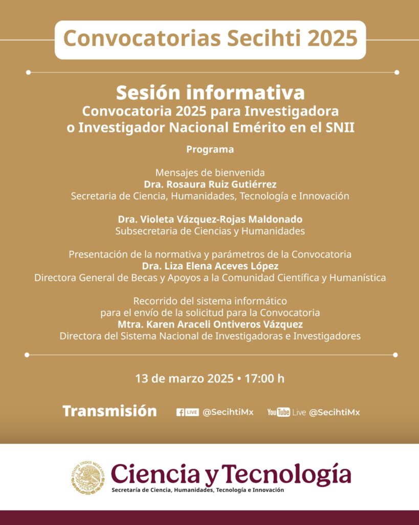 En el marco de la apertura de las Convocatorias 2025, la Secihti organiza la sesión informativa “Convocatoria 2025 para Investigadora o Investigador Nacional Emérito en el SNII”.