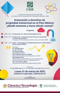 ![]() Registro: https://acortar.link/WPXRJp Síntesis: British Council, en asociación con la Universidad de Birmingham y el Tecnológico de Monterrey invitan investigadoras e investigadores con sede en México y Reino Unido a participar y explorar los desafíos relacionados con la igualdad de género y la resiliencia climática, particularmente a través de soluciones acreditadas como innovadoras. El taller, organizado […] ![]() En el marco del Día Mundial de la Propiedad Intelectual, la División de Estudios Jurídicos del Centro de Investigación y Docencia Económicas (CIDE) invita a participar en el evento: “Innovación y derechos de propiedad intelectual en el Plan México: ¿dónde estamos y hacia dónde vamos?”. |