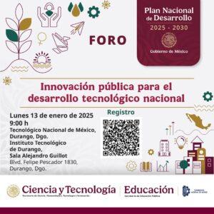 La Secihti contribuye en la elaboración del PND; por ello, en colaboración con la SEP —mediante el TecNM— y el Gobierno del Estado de Durango, coordina el foro “Innovación pública para el desarrollo tecnológico nacional”, el cual se llevará a cabo en las instalaciones del Instituto Tecnológico de Durango, Blvd. Felipe Pescador 1830, Nueva Vizcaya, Durango, Durango.