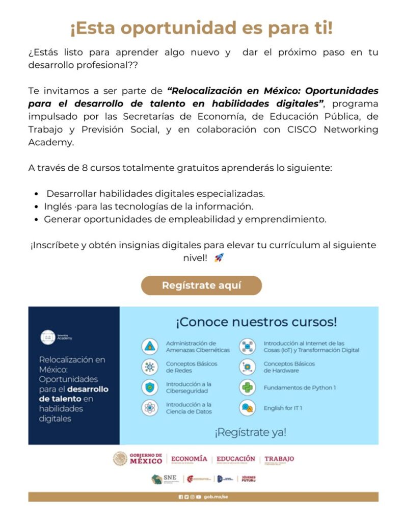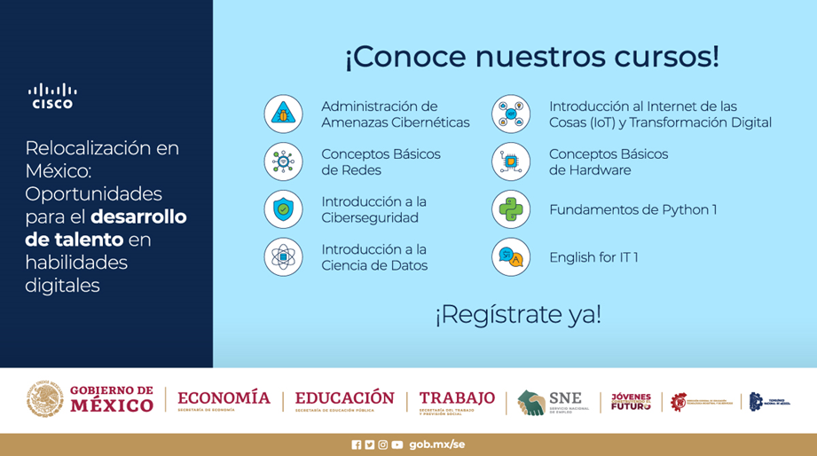 el talento mexicano representa actualmente una de las principales ventajas en la estrategia de atracción de inversión diseñada para aprovechar las mejores oportunidades del fenómeno de relocalización. Con esta iniciativa, la SE, SEP y STPS en colaboración con Cisco Networking Academy, ofrecen capacitación gratuita en habilidades digitales.