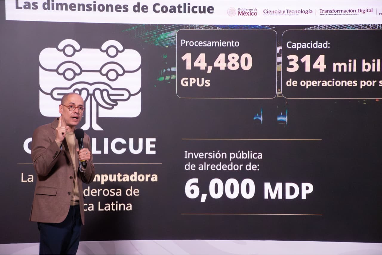 En uso de la voz, el titular de la ATDT, José Antonio Peña Merino, detalló que, con una potencia estimada de 314 PetaFLOPS y 14,480 GPUs, Coatlicue será capaz de realizar 314 mil billones de operaciones por segundo, gracias a su arquitectura compuesta por cerca de 7,500 chasis —equivalentes a casi 400 mil computadoras trabajando en paralelo— conectados a sistemas de enfriamiento, energía y redes de alta velocidad.