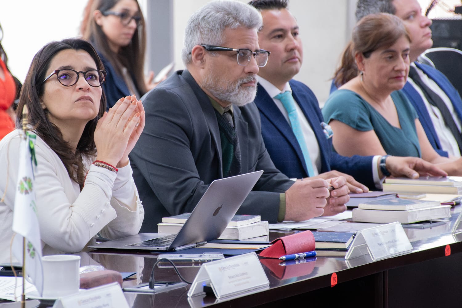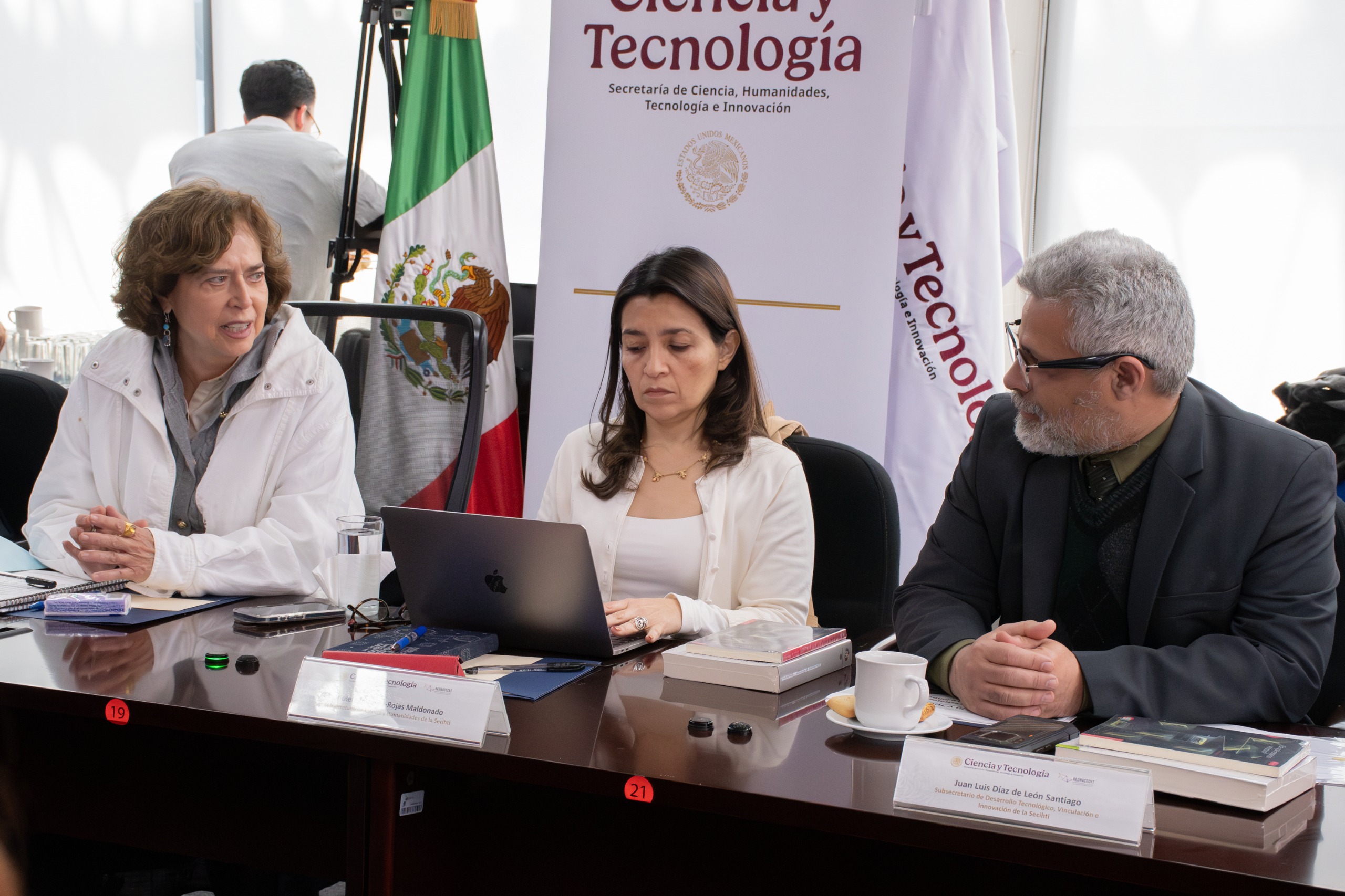 Por parte de la Secihti atendieron la reunión: la subsecretaria de Ciencia y Humanidades, Violeta Vázquez-Rojas Maldonado; el subsecretario de Desarrollo Tecnológico, Vinculación e Innovación, Juan Luis Díaz de León Santiago; el titular de la Unidad de Asuntos Jurídicos, Eduardo Guerrero Villegas; el director general de Planeación y Evaluación, Mathieu Hautefeuille; la directora general de Becas y Apoyos a la Comunidad Científica y Humanística, Liza Elena Aceves López; de la Oficina de la Secretaria, Ofelia Angulo Guerrero y Adrián Velázquez Ramírez; y Celina Peña Guzmán, quien fue presentada como la próxima subsecretaria de Desarrollo Tecnológico, Vinculación e Innovación.